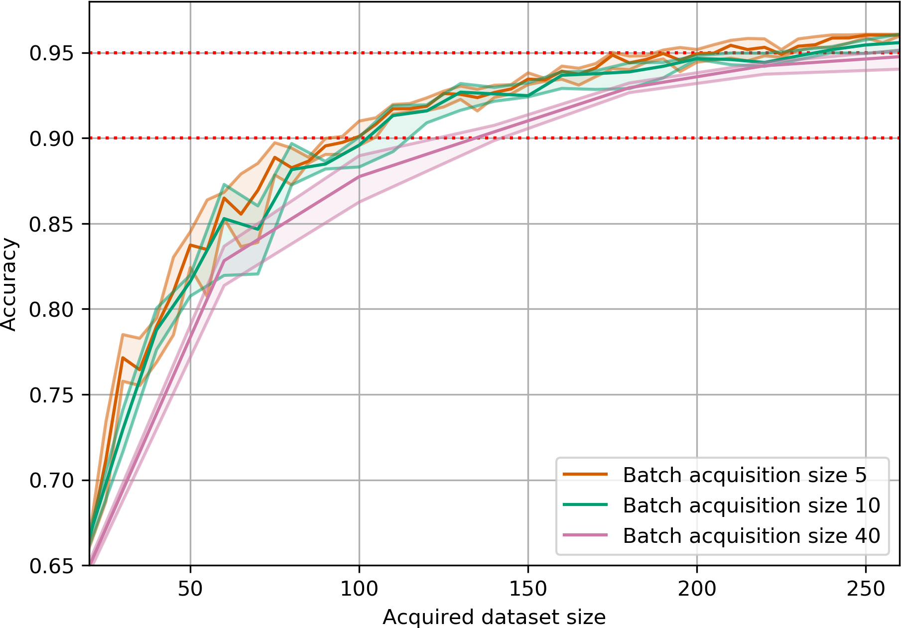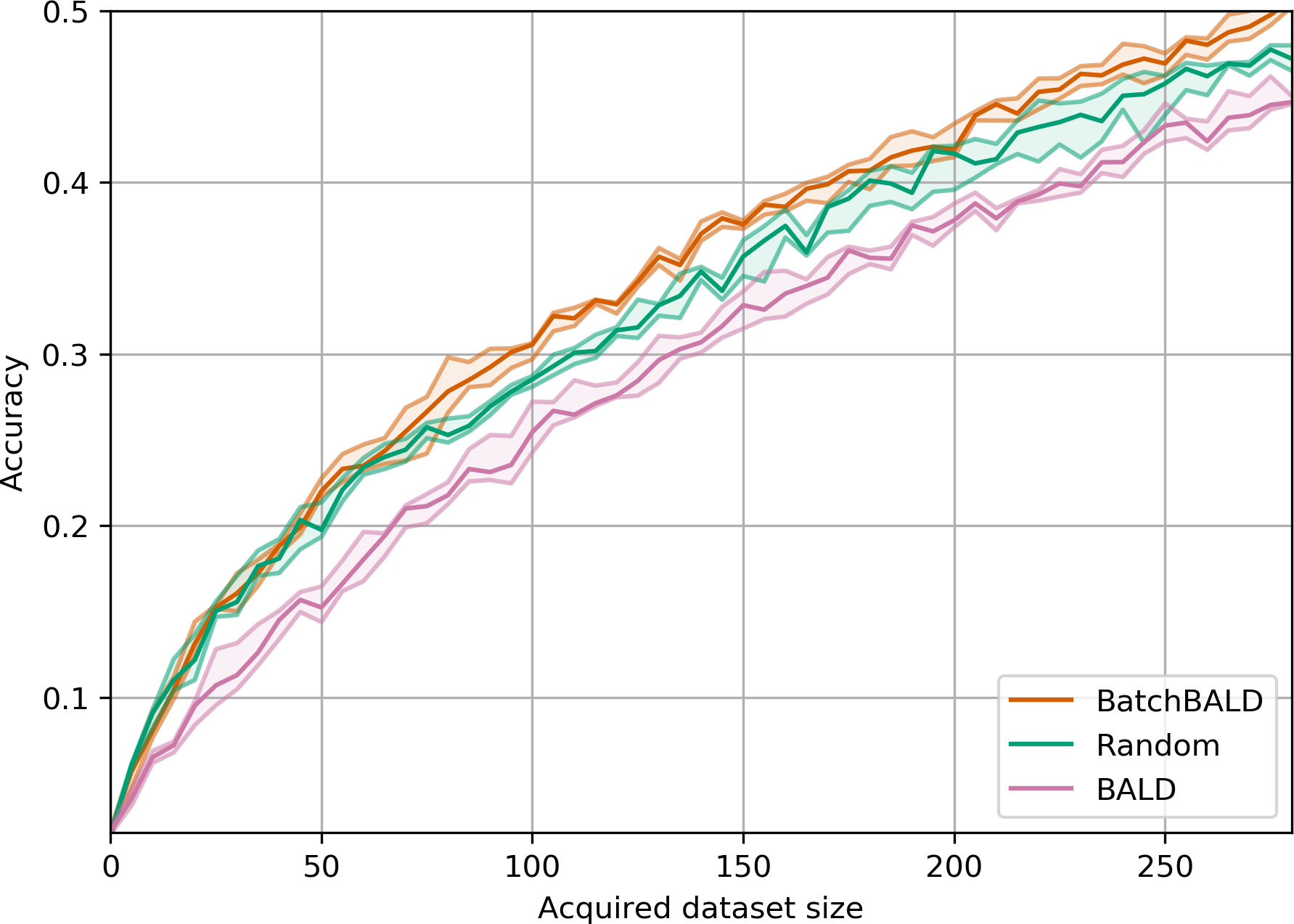 BatchBALD consistently outperforms both random acquisition and BALD while BALD is unable to beat random acquisition.