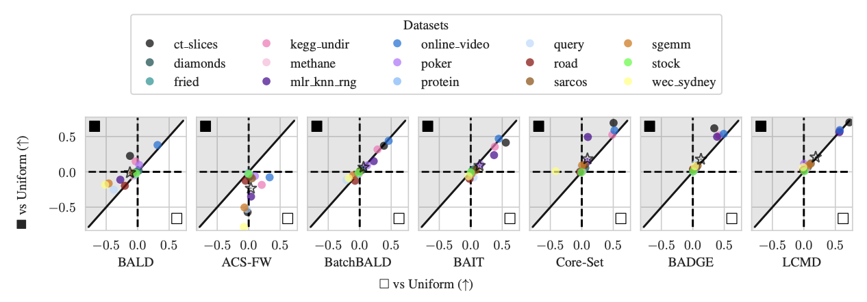 Figure 4: Average Logarithmic RMSE by regression datasets for DNNs: Black-box/prediction-space ■ vs white-box/weight-space □ (vs Uniform). Improvement of the white-box □ method over the uniform baseline on the x-axis and the improvement of the black-box ■ method over the uniform baseline on the y-axis. The average over all datasets is marked with a star ⋆.