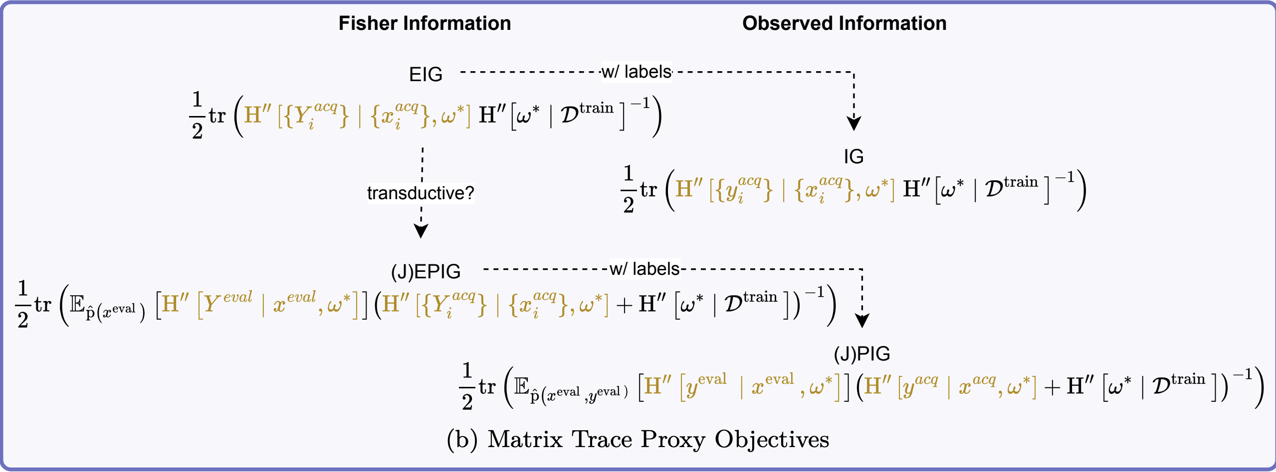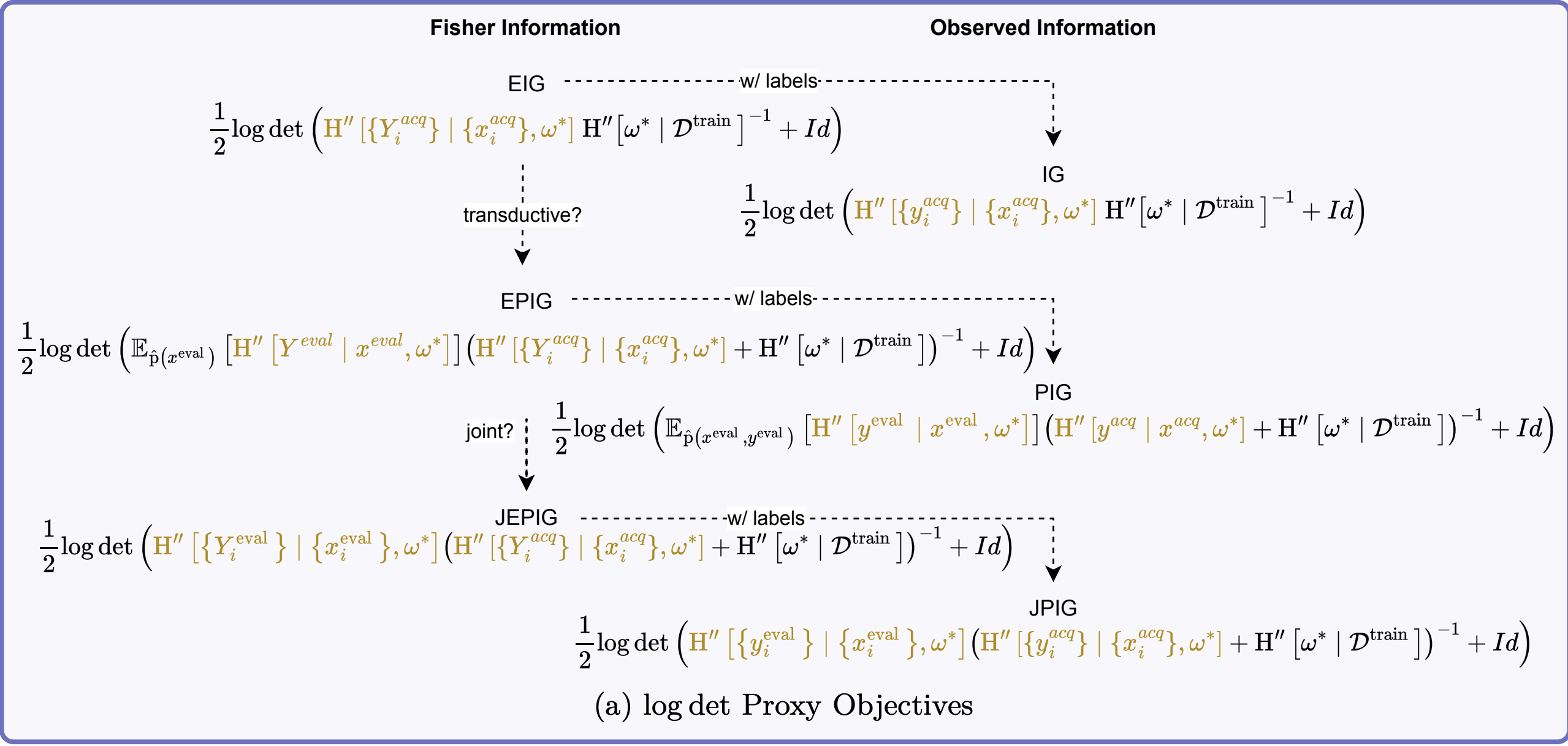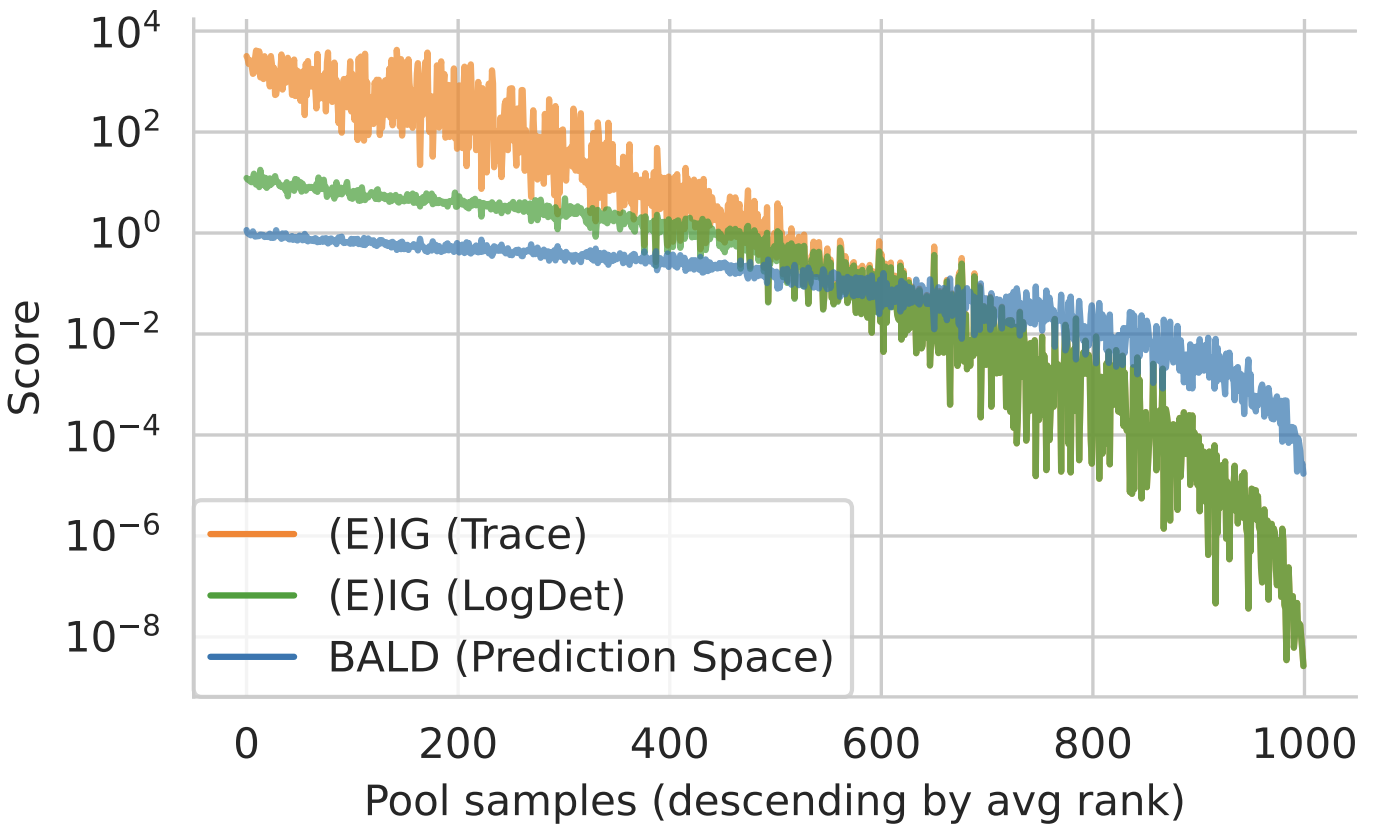 \[ \require{mathtools} \DeclareMathOperator{\opExpectation}{\mathbb{E}} \newcommand{\E}[2]{\opExpectation_{#1} \left [ #2 \right ]} \newcommand{\simpleE}[1]{\opExpectation_{#1}} \newcommand{\implicitE}[1]{\opExpectation \left [ #1 \right ]} \DeclareMathOperator{\opVar}{\mathrm{Var}} \newcommand{\Var}[2]{\opVar_{#1} \left [ #2 \right ]} \newcommand{\implicitVar}[1]{\opVar \left [ #1 \right ]} \newcommand\MidSymbol[1][]{% \:#1\:} \newcommand{\given}{\MidSymbol[\vert]} \DeclareMathOperator{\opmus}{\mu^*} \newcommand{\IMof}[1]{\opmus[#1]} \DeclareMathOperator{\opInformationContent}{H} \newcommand{\ICof}[1]{\opInformationContent[#1]} \newcommand{\xICof}[1]{\opInformationContent(#1)} \newcommand{\sicof}[1]{h(#1)} \DeclareMathOperator{\opEntropy}{H} \newcommand{\Hof}[1]{\opEntropy[#1]} \newcommand{\xHof}[1]{\opEntropy(#1)} \DeclareMathOperator{\opMI}{I} \newcommand{\MIof}[1]{\opMI[#1]} \DeclareMathOperator{\opTC}{TC} \newcommand{\TCof}[1]{\opTC[#1]} \newcommand{\CrossEntropy}[2]{\opEntropy(#1 \MidSymbol[\Vert] #2)} \DeclareMathOperator{\opKale}{D_\mathrm{KL}} \newcommand{\Kale}[2]{\opKale(#1 \MidSymbol[\Vert] #2)} \DeclareMathOperator{\opJSD}{D_\mathrm{JSD}} \newcommand{\JSD}[2]{\opJSD(#1 \MidSymbol[\Vert] #2)} \DeclareMathOperator{\opp}{p} \newcommand{\pof}[1]{\opp(#1)} \newcommand{\pcof}[2]{\opp_{#1}(#2)} \newcommand{\hpcof}[2]{\hat{\opp}_{#1}(#2)} \DeclareMathOperator{\opq}{q} \newcommand{\qof}[1]{\opq(#1)} \newcommand{\qcof}[2]{\opq_{#1}(#2)} \newcommand{\varHof}[2]{\opEntropy_{#1}[#2]} \newcommand{\xvarHof}[2]{\opEntropy_{#1}(#2)} \newcommand{\varMIof}[2]{\opMI_{#1}[#2]} \newcommand{\Y}{Y} \newcommand{\y}{y} \newcommand{\X}{\boldsymbol{X}} \newcommand{\x}{\boldsymbol{x}} \newcommand{\w}{\boldsymbol{\theta}} \newcommand{\wstar}{\boldsymbol{\theta^*}} \newcommand{\W}{\boldsymbol{\Theta}} \newcommand{\D}{\mathcal{D}} \DeclareMathOperator{\opf}{f} \newcommand{\fof}[1]{\opf(#1)} \newcommand{\indep}{\perp\!\!\!\!\perp} \newcommand{\HofHessian}[1]{\opEntropy''[#1]} \newcommand{\specialHofHessian}[2]{\opEntropy''_{#1}[#2]} \newcommand{\HofJacobian}[1]{\opEntropy'[#1]} \newcommand{\specialHofJacobian}[2]{\opEntropy'_{#1}[#2]} \DeclareMathOperator{\tr}{tr} \DeclareMathOperator{\opCovariance}{\mathrm{Cov}} \newcommand{\Cov}[2]{\opCovariance_{#1} \left [ #2 \right ]} \newcommand{\implicitCov}[1]{\opCovariance \left [ #1 \right ]} \newcommand{\FisherInfo}{\HofHessian} \newcommand{\prelogits}{\boldsymbol{z}} \newcommand{\typeeval}{\mathrm{eval}} \newcommand{\typetest}{\mathrm{test}} \newcommand{\typetrain}{\mathrm{train}} \newcommand{\typeacq}{\mathrm{acq}} \newcommand{\typepool}{\mathrm{pool}} \newcommand{\xeval}{\x^\typeeval} \newcommand{\xtest}{\x^\typetest} \newcommand{\xtrain}{\x^\typetrain} \newcommand{\xacq}{\x^\typeacq} \newcommand{\xpool}{\x^\typepool} \newcommand{\xacqsettar}{\x^{\typeacq, *}} \newcommand{\Xeval}{\X^\typeeval} \newcommand{\Xtest}{\X^\typetest} \newcommand{\Xtrain}{\X^\typetrain} \newcommand{\Xacq}{\X^\typeacq} \newcommand{\Xpool}{\X^\typepool} \newcommand{\yeval}{\y^\typeeval} \newcommand{\ytest}{\y^\typetest} \newcommand{\ytrain}{\y^\typetrain} \newcommand{\yacq}{\y^\typeacq} \newcommand{\ypool}{\y^\typepool} \newcommand{\Ytest}{\Y^\typetest} \newcommand{\Ytrain}{\Y^\typetrain} \newcommand{\Yeval}{\Y^\typeeval} \newcommand{\Yacq}{\Y^\typeacq} \newcommand{\Ypool}{\Y^\typepool} \newcommand{\Xrate}{\boldsymbol{\mathcal{\X}}} \newcommand{\Yrate}{\mathcal{\Y}} \newcommand{\batchvar}{\mathtt{K}} \newcommand{\poolsize}{\mathtt{M}} \newcommand{\trainsize}{\mathtt{N}} \newcommand{\evalsize}{\mathtt{E}} \newcommand{\testsize}{\mathtt{T}} \newcommand{\numclasses}{\mathtt{C}} \newcommand{\xevalset}{{\x^\typeeval_{1..\evalsize}}} \newcommand{\xtestset}{{\x^\typetest_{1..\testsize}}} \newcommand{\xtrainset}{{\x^\typetrain_{1..\trainsize}}} \newcommand{\xacqset}{{\x^\typeacq_{1..\batchvar}}} \newcommand{\xpoolset}{{\x^\typepool_{1..\poolsize}}} \newcommand{\xacqsetstar}{{\x^{\typeacq, *}_{1..\batchvar}}} \newcommand{\Xevalset}{{\X^\typeeval_{1..\evalsize}}} \newcommand{\Xtestset}{{\X^\typetest_{1..\testsize}}} \newcommand{\Xtrainset}{{\X^\typetrain_{1..\trainsize}}} \newcommand{\Xacqset}{{\X^\typeacq_{1..\batchvar}}} \newcommand{\Xpoolset}{{\X^\typepool_{1..\poolsize}}} \newcommand{\yevalset}{{\y^\typeeval_{1..\evalsize}}} \newcommand{\ytestset}{{\y^\typetest_{1..\testsize}}} \newcommand{\ytrainset}{{\y^\typetrain_{1..\trainsize}}} \newcommand{\yacqset}{{\y^\typeacq_{1..\batchvar}}} \newcommand{\ypoolset}{{\y^\typepool_{1..\poolsize}}} \newcommand{\Ytestset}{{\Y^\typetest_{1..\testsize}}} \newcommand{\Ytrainset}{{\Y^\typetrain_{1..\trainsize}}} \newcommand{\Yevalset}{{\Y^\typeeval_{1..\evalsize}}} \newcommand{\Yacqset}{{\Y^\typeacq_{1..\batchvar}}} \newcommand{\Ypoolset}{{\Y^\typepool_{1..\poolsize}}} \newcommand{\yset}{{\y_{1..n}}} \newcommand{\Yset}{{\Y_{1..n}}} \newcommand{\xset}{{\x_{1..n}}} \newcommand{\Xset}{{\X_{1..n}}} \newcommand{\pdataof}[1]{\hpcof{\mathrm{true}}{#1}} \newcommand{\ptrainof}[1]{\hpcof{\mathrm{train}}{#1}} \newcommand{\similarityMatrix}[2]{{S_{#1}[#2]}} \newcommand{\HofJacobianData}[1]{{\hat{\opEntropy}'[#1]}} \newcommand{\HofJacobianDataShort}{\hat{\opEntropy}'} \newcommand{\Dacq}{\D^{\typeacq}} \newcommand{\Dtest}{\D^{\typetest}} \newcommand{\Dpool}{\D^{\typepool}} \newcommand{\Deval}{\D^{\typeeval}} \]
