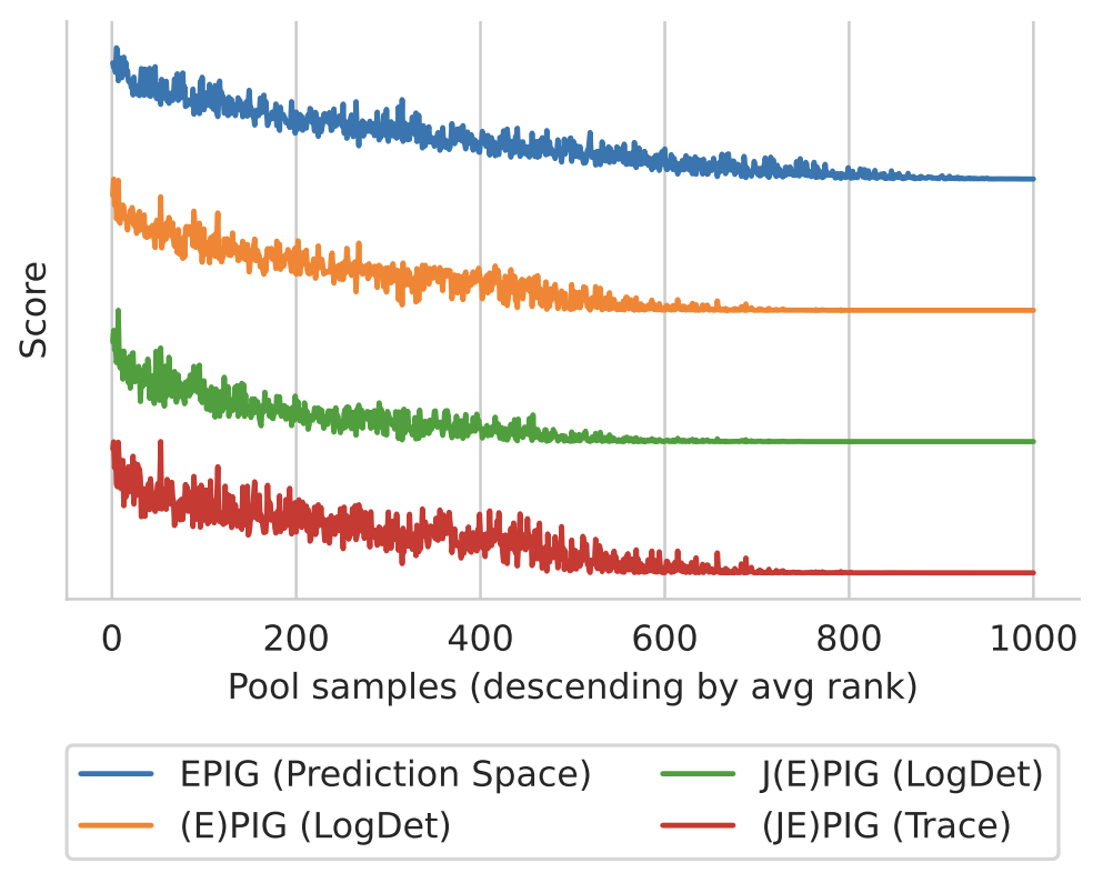 Figure 3: (J)EPIG Approximations (Normalized). The scores match qualitatively. Note we have reversed the ordering for the proxy objectives for JEPIG and EPIG as they are minimized while EPIG is maximized.